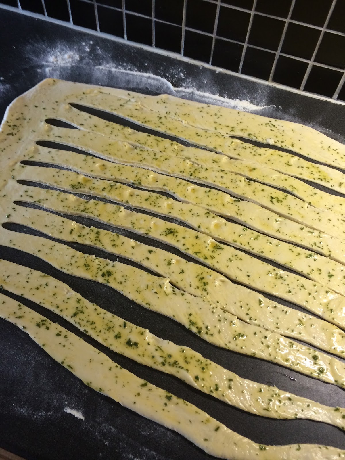 Zamesiti testo ( mesiti malo duze ako mesite rucno) i ostaviti najmanje 40 minuta da naraste . Nadsoslo testo razvuci oklagijom i premazati vec pripremljenim otopljenim margarinom , persunom sitno naseckanim i iseci kaiseve ( kao na slici) ali ne do kraja